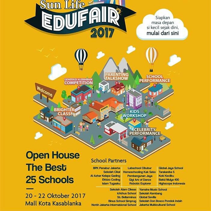 Tahun ini, saya pun dipusingkan dengan urusan sekolah Kekey. Sudah waktunya dia masuk ke SD dan kami mulai mencari sekolah yang cocok. Sambil mencocokkan dengan kantong tentunya. Kebetulan sekali, teman mengajak untuk mengunjungi #SunLifeEduFair2017 #LebihBaik yang diselenggarakan beberapa sekolah swasta ternama dengan Sun Life Indonesia, perusahaan asuransi asal Kanada di Kota Kasablanka kemarin, Sabtu-Minggu (21-22 Oktober 2017). Pucuk dicinta ulam tiba. Sabtu saya berangkat dengan Kekey, karena Mama-nya mesti mengisi workshop di Jakarta Selatan, jadi tidak bisa ikut bersama. Ada beberapa talkshow yang disampaikan sekolah-sekolah dan juga pengalaman Mona Ratuliu saat menyiapkan pendidikan anaknya yang lumayan bermanfaat. Artis yang bisa dibilang lumayan kenceng duitnya pun, masih mikirian asuransi pendidikan anak ternyata, he-he-he...